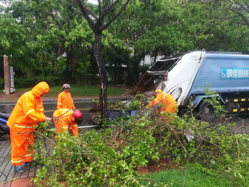 今年第9號(hào)臺(tái)風(fēng)“山神”的中心于今天凌晨4點(diǎn)50分前后,在海南萬(wàn)寧市萬(wàn)城鎮(zhèn)沿海登陸。受其影響,今天三亞、陵水有大到暴雨,將三亞、陵水街頭不少樹(shù)木刮倒,到處是殘枝敗葉,一片狼藉。臺(tái)風(fēng)中,為了確保市容環(huán)境的整潔、干凈,集團(tuán)公司安排環(huán)衛(wèi)工人全員上崗,加緊清理街道路面,使城市迅速恢復(fù)潔凈。