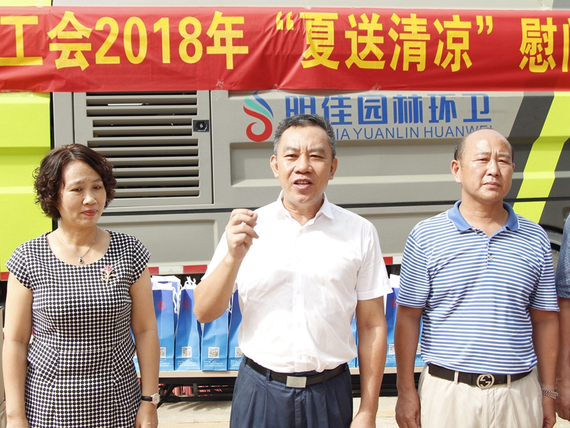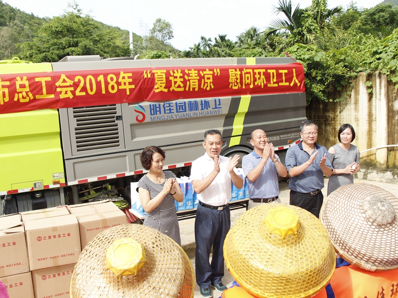 “你們辛苦了!感謝你們?yōu)槿齺喪忻、游客?chuàng)造了一個(gè)干凈整潔的人居環(huán)境,為三亞市“創(chuàng)文鞏衛(wèi)”工作作出的突出貢獻(xiàn)。”。張羽飛代表三亞市總工會向集團(tuán)公司全體職工致以親切的慰問。他指出,環(huán)衛(wèi)工人頭頂列日,揮灑汗水,以“寧愿一人臟,換來萬家凈”的精神,為靚扮鹿城、建設(shè)國際化熱帶濱海旅游精品城市提供衛(wèi)生保障。他勉勵大家繼續(xù)發(fā)揚(yáng)三亞環(huán)衛(wèi)人的精神,勇當(dāng)尖兵的決心,提高環(huán)衛(wèi)作業(yè)質(zhì)量,在三亞市社會文明大行動和新一輪“創(chuàng)文鞏衛(wèi)”工作中作出新的更大貢獻(xiàn)。