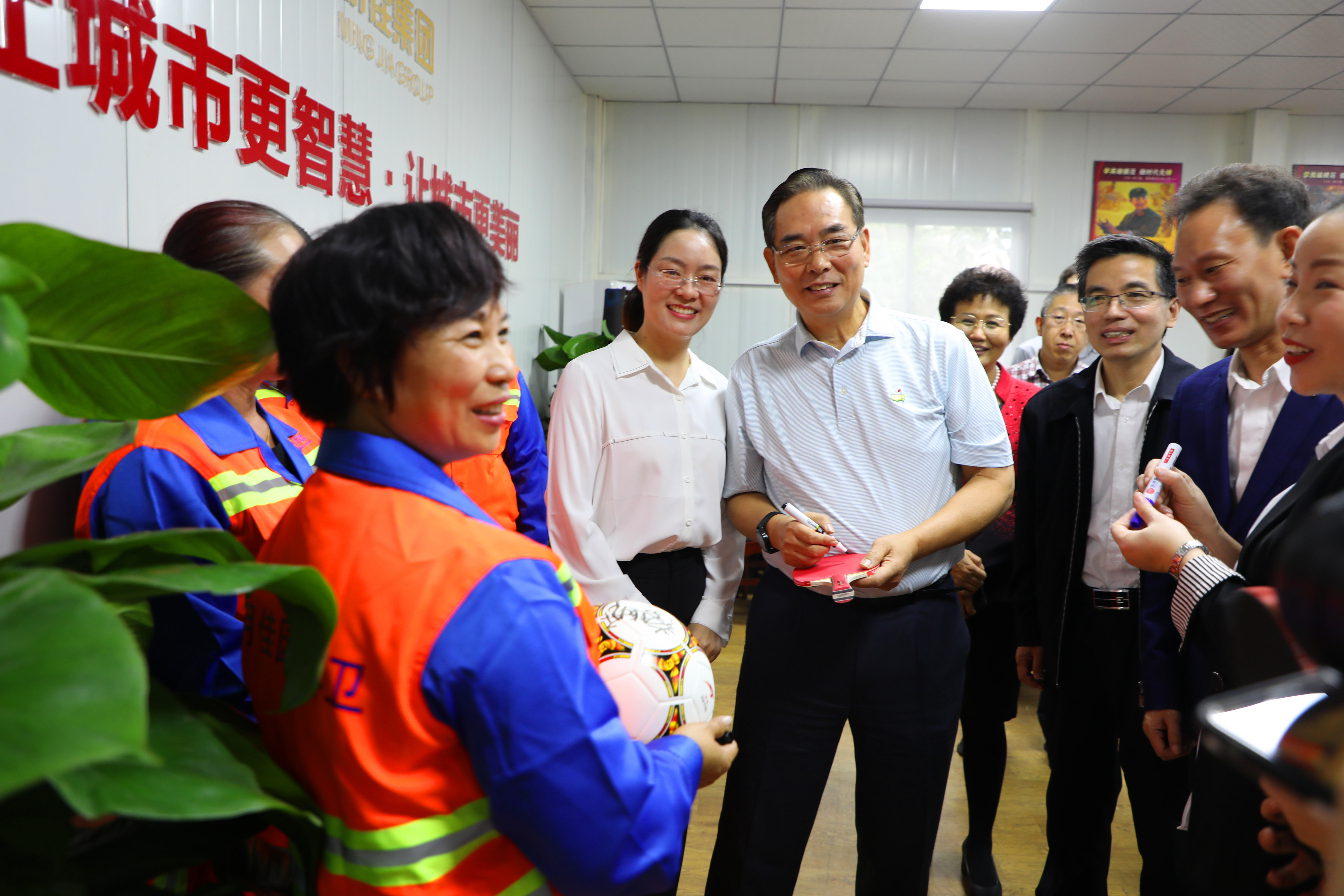 座談會結(jié)束后,明佳集團一些職工表示非常喜愛乒乓球及足球運動,一直都是蔡副主席的粉絲,希望獲得蔡振華副主席的親筆簽名。蔡副主席非常親切地為他們簽名,并與之合影留念。