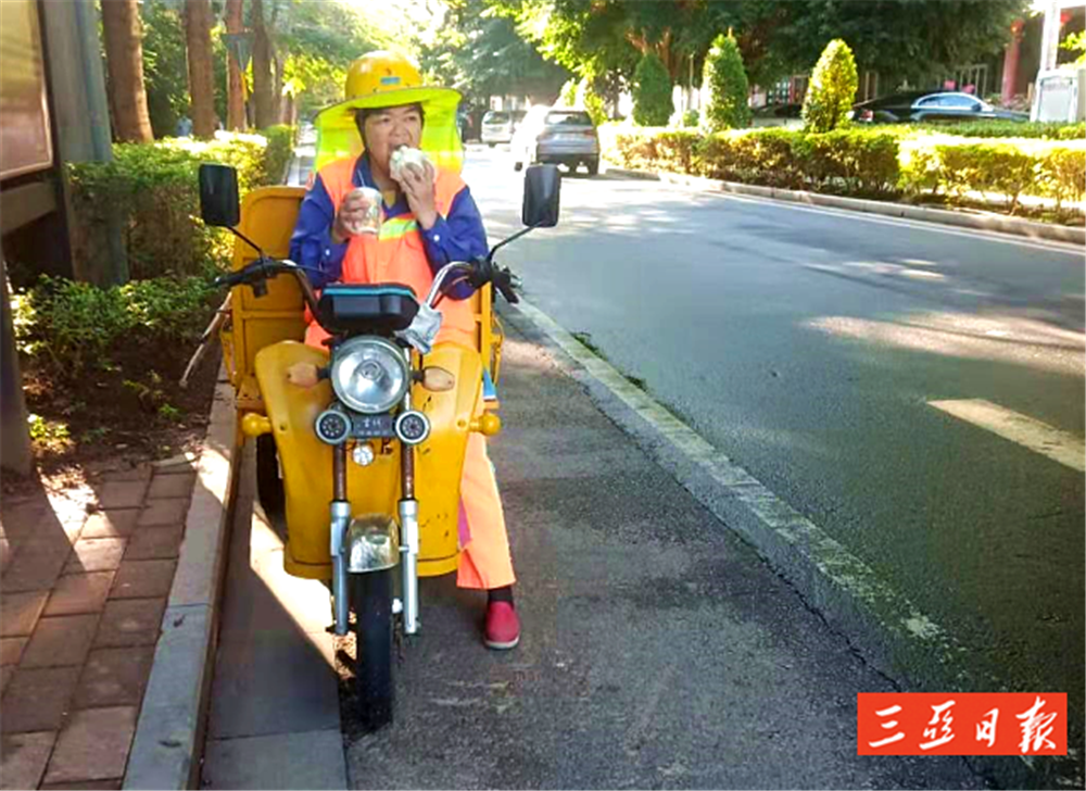 早上常常來(lái)不及在家里吃早餐,藍(lán)亞燕會(huì)帶著微燙的早餐來(lái)上班,等清理一段路后,才會(huì)吃上一口,而此時(shí)早餐往往已經(jīng)涼了。如果累了,要么席地而坐休息幾分鐘,要么在她的“敞篷車”上休息一會(huì)。