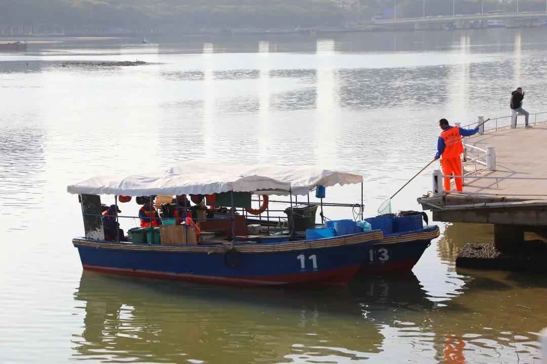 每天工作都是從早上7點(diǎn)鐘到下午的6點(diǎn)半,我們是分段來的。主要是坐船去收集河上的一些垃圾,一天巡邏清掃一次,清掃完了回來再巡邏保潔。水面和紅樹林里的垃圾都要清理。下雨天我們也要出來(工作),臺風(fēng)天就要做好防風(fēng)的工作,如果是下雨,我們一樣要出來打撈垃圾。