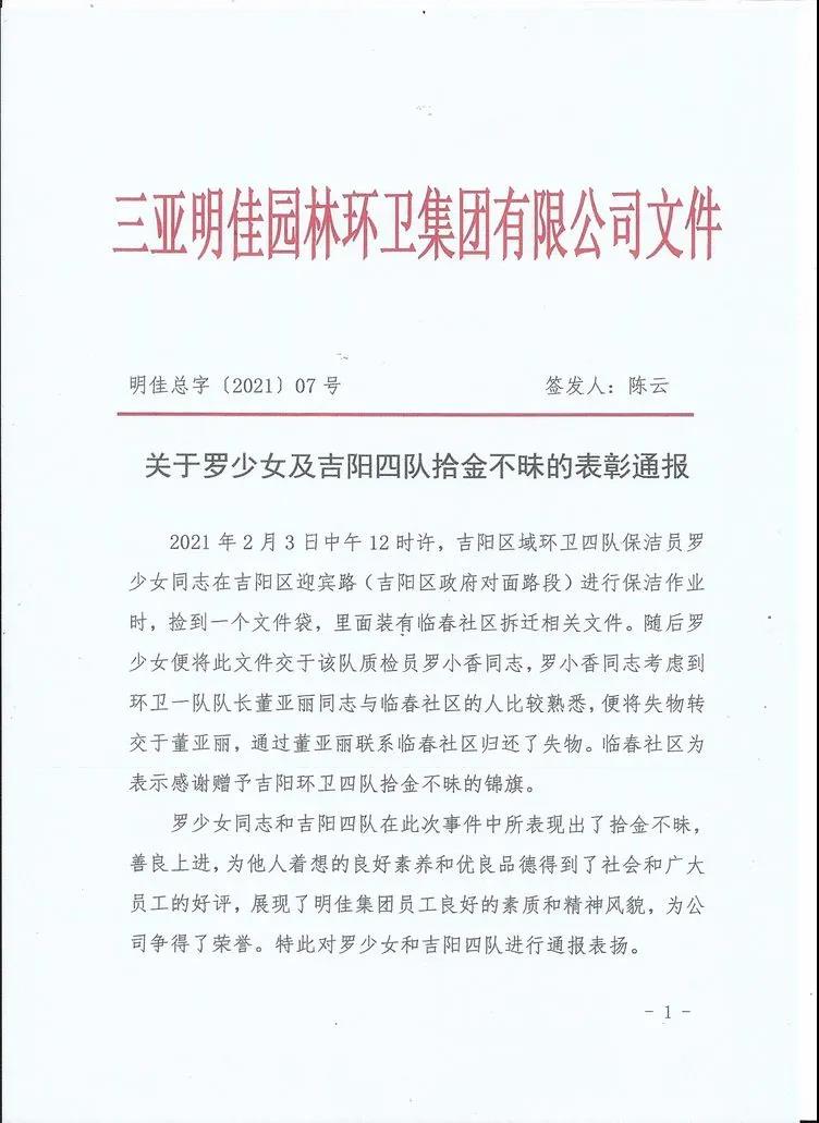 會(huì)上,明佳集團(tuán)黨支部書記、董事長陳明宣讀了《關(guān)于羅少女及吉陽四隊(duì)拾金不昧的表彰通報(bào)》