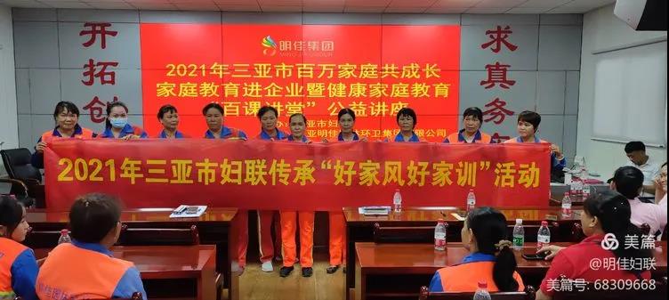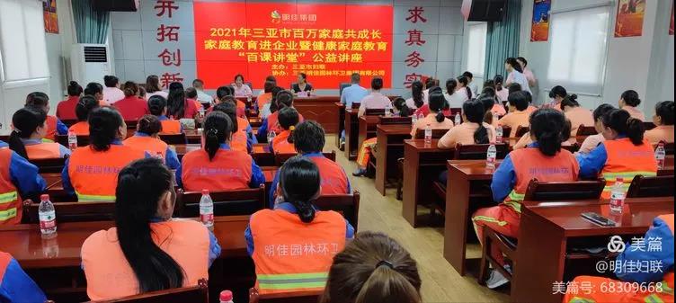 為引導(dǎo)廣大婦女帶動家庭成員大力培育新時代家庭觀,推動社會主義核心價值觀落細(xì)落小落實(shí)到家庭,切實(shí)落實(shí)家庭教育立德樹人的根本任務(wù),根據(jù)省婦聯(lián)“家家幸福安康工程”部署,結(jié)合“我為婦女群眾辦實(shí)事”實(shí)踐活動。2021年7月20日下午15時30分,由市婦聯(lián)主辦、明佳婦聯(lián)協(xié)辦的2021年三亞市百萬家庭共成長家庭教育進(jìn)企業(yè)暨健康家庭教育“百課講堂”公益培訓(xùn)課在明佳三樓會議室成功舉行,培訓(xùn)內(nèi)容為家庭教育知識和女性健康知識,明佳集團(tuán)80余名職工參加了此次培訓(xùn)。