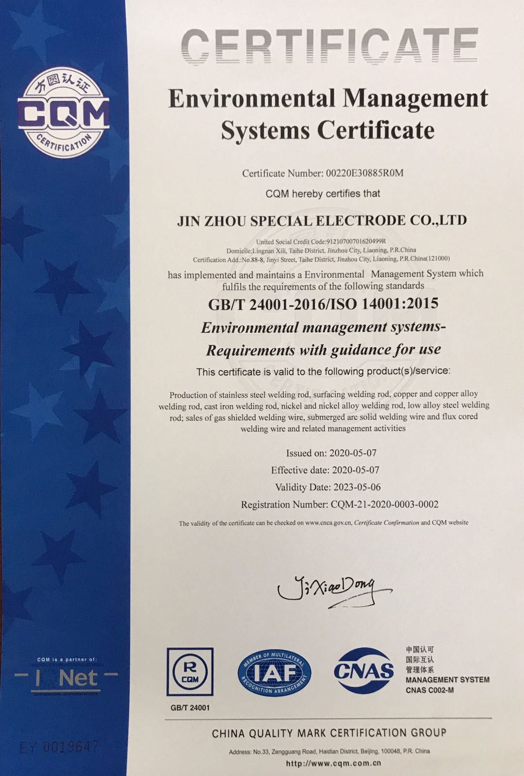 Certification Category:GB/T 24001-2016/ISO 14001:2015 Environmental management systems-Requirements with guidance for use
